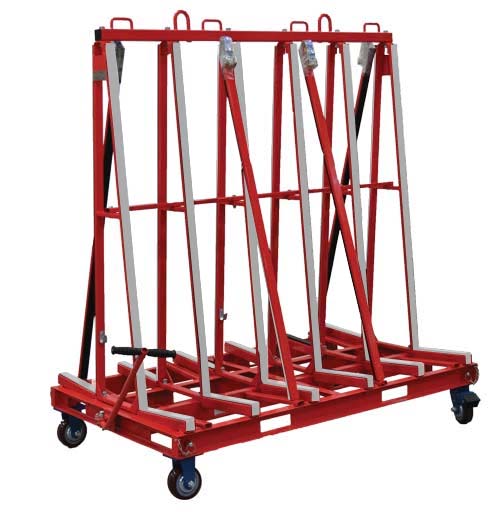 The Hercules Kitchen Stone Transport Rack are designed to store and transport large natural stone counter tops and island pieces. Each cart comes with forklift receivers to lift from all four sides of the A-Frame. The base and uprights come with replaceable rubber to prevent scratches. The 6’ long transport A-Frame cart has 14 (7 per side) upright openings and 4 securing bars with tie-down straps for secure transport.