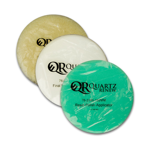 Quartz Renew was developed by professional restoration experts, to address issues from scratching to chemical burns, to abrasions and even everyday cleaning needs. The Quartz Renew system contains resin pads for seam polishing edge polishing and heavy damage, 4 step felt pads for lighter damage (light scratches, etc.), the Quartz Renew Polish for very light damage and blending finish after diamond polishing. See our live repair videos for more information