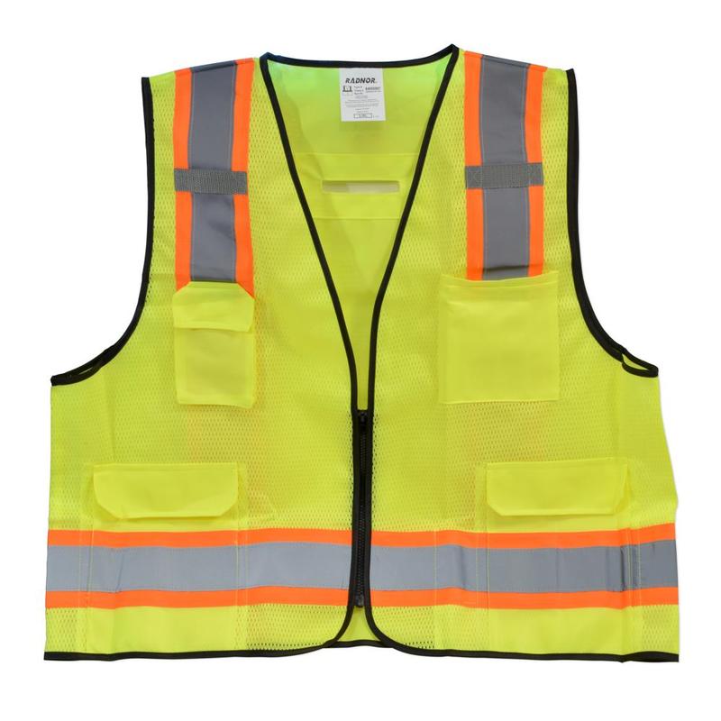 High visibility florescent neon lime mesh front zipper safety vest with two-tone reflective strips.