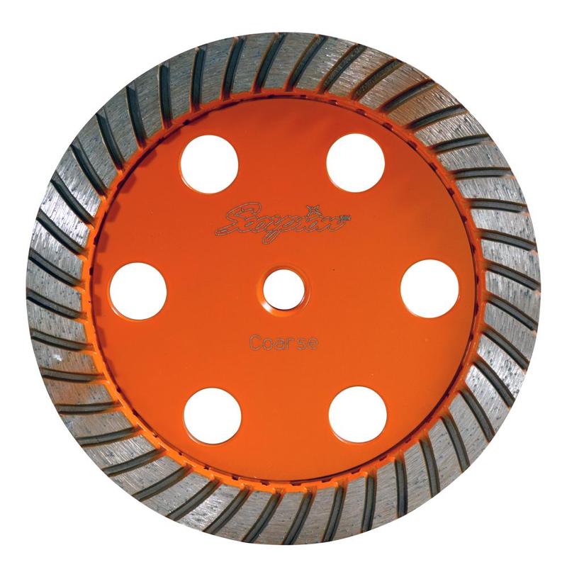Scorpion Turbo Dry Diamond Cup Wheel, 7", Coarse are offered in 3 grits to fit your application: Coarse grit for heavy, quick stock removal; Medium grit for final shaping; and Fine grit for soft material or for getting close to layout lines without fear of chipping the edge.