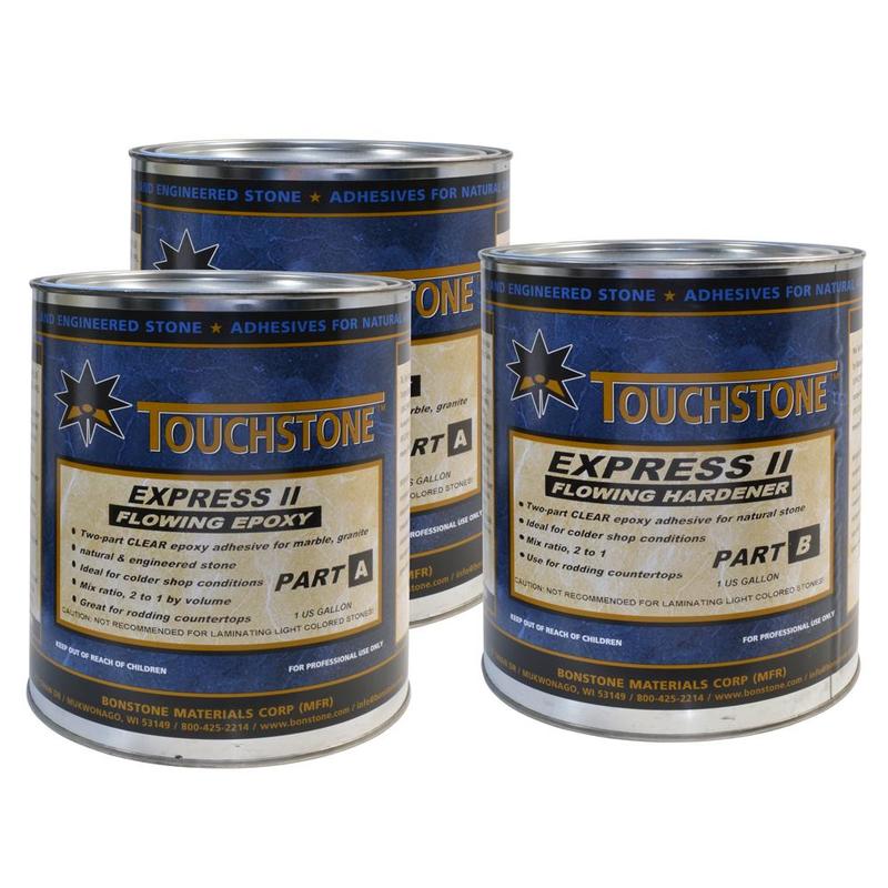 Touchstone Express II Flowing Epoxy Adhesive System, 2 Gal is a two-part transparent epoxy that sets up in 45 to 60 minutes at 75°F and will enable the fabricator to work on the edge in half the time it takes for most epoxies.