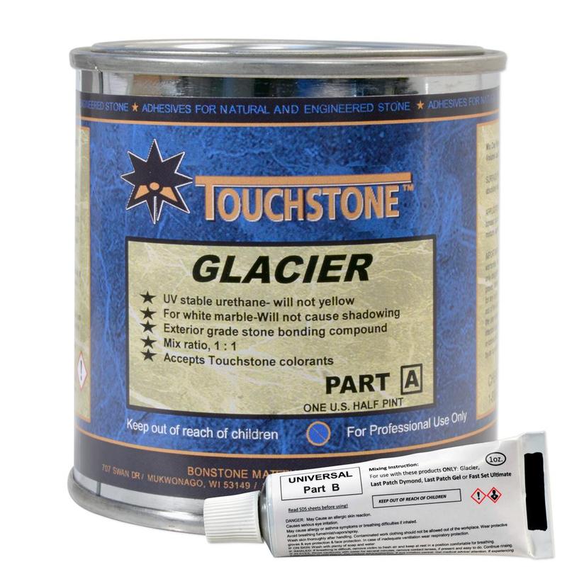 The clarity of Glacier Epoxy works well especially with light-colored stone, such as Carrera and Calcutta marble. Also works great with engineered stones and light colored granite. It can be tinted with Touchstone liquid tints and may be used for exterior installations.