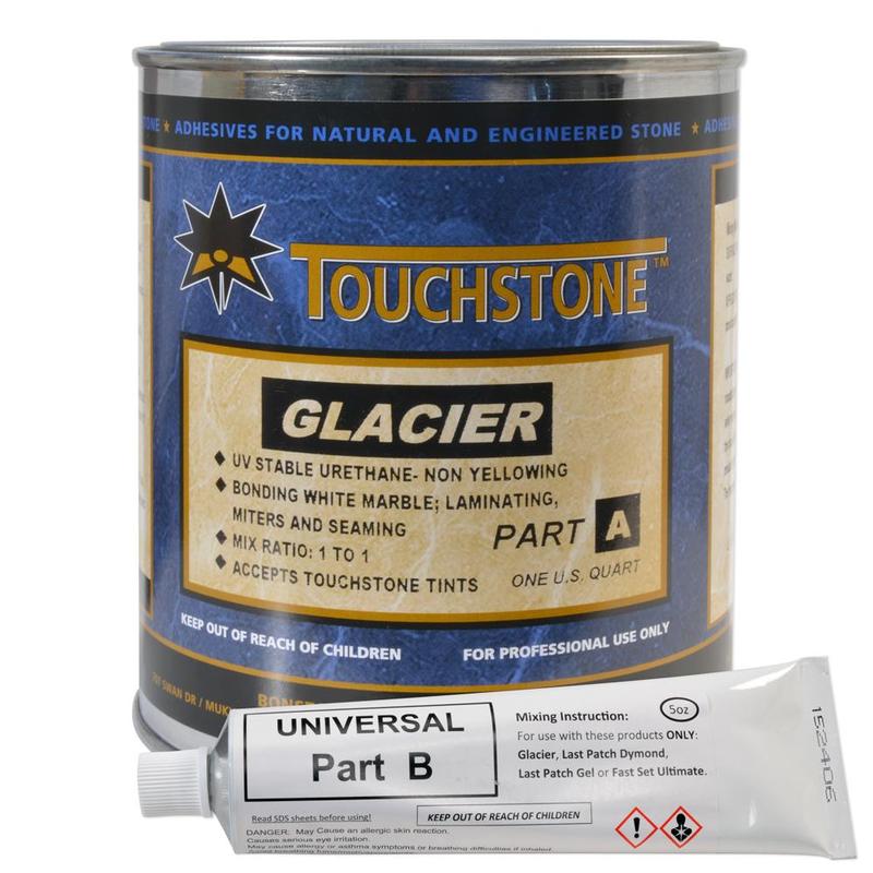 Touchstone Glacier Non-Yellowing Knife Grade, 1 qt Kit is very user-friendly and bonds well to construction materials. It can be used for patching, bonding and mending natural stone, as well as laminating countertop edges like bullnoses and aprons.