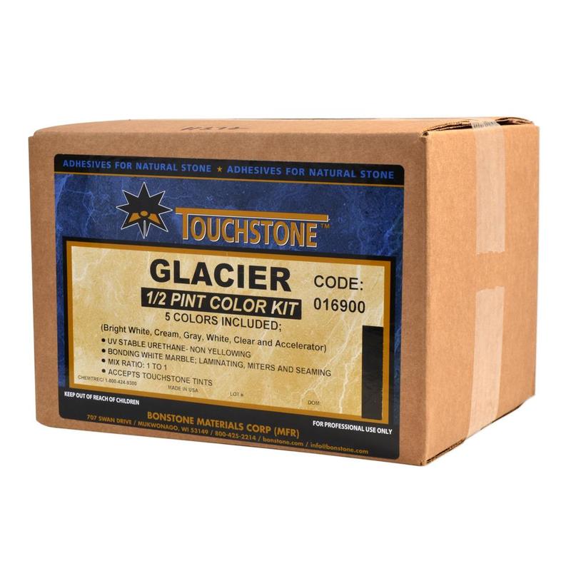 Touchstone Glacier is a revolutionary clear, fast-curing, non-staining, UV-stable adhesive designed for laminating and fabricating natural stone countertops. Compared to competitive products, it will SAVE you TIME and MONEY, due to its convenient and forgiving mix ratio.
