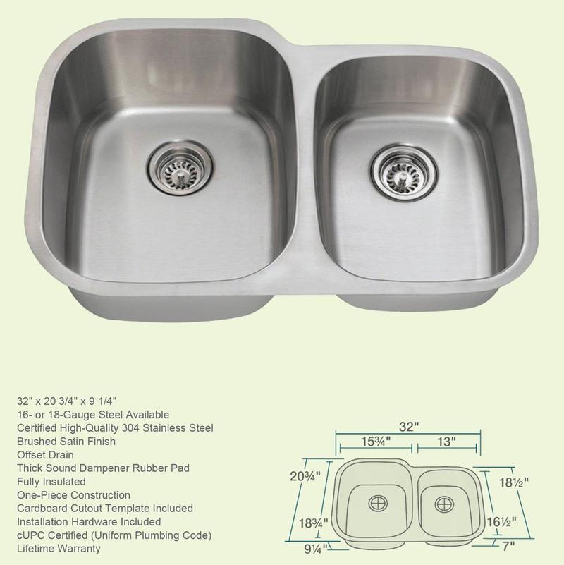 The offset double bowl undermount sink is constructed from 304 grade stainless steel with a chromium/nickel content and is available in 18 gauge thicknesses. The surface has a brushed satin finish to help mask small scratches that occur over time and keep your sink looking great for years. The overall dimensions are 32" x 20-3/4" x 7"(L) x 9"(R) and a 33” minimum cabinet size is required. This sink contains a 3 ½” offset drain, is fully insulated and comes with sound dampening pads.