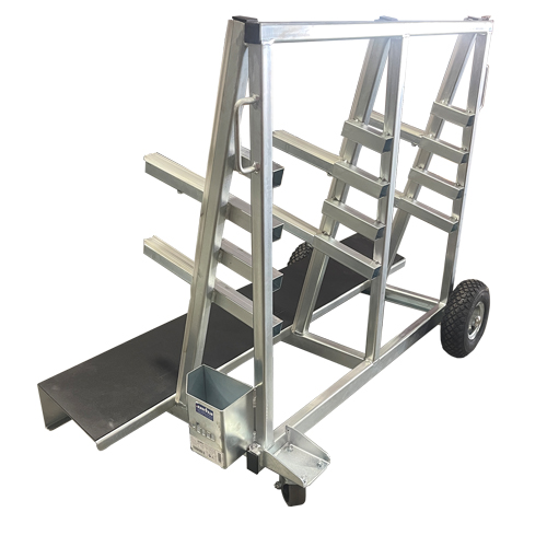 The Weha Universal Stone Buggy Shop Cart is a great in-shop buggy for storing tops, remnants, and backsplashes. Made with galvanized steel construction, the wheels are placed outside the frame for better stability.2 pneumatic and 2 locking casters. Solid base for all size pieces. Replaceable rubber-covered uprights.Also comes with 6 rubber-covered removable steel tube stops with 4 height adjustment shelves built intothe frame. This allows for multilevel storage. Excellent for backsplashes! Easily store a complete job:counter top on the bottom, backsplashes on top! Also an outstanding installation cart. Perfect for commercial and residential applications.